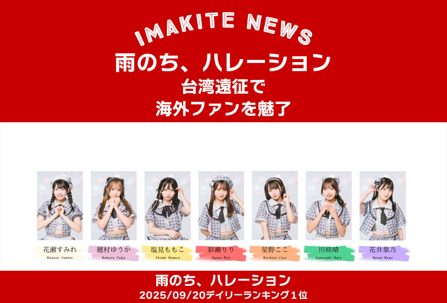 「甘酸っぱい青春」をテーマに、爽やかな疾走感のある楽曲で注目を集める雨のち、ハレーション。現在は9月19日から21日まで台湾遠征中で、海外のファンに向けてステージを披露している。国内のみならずアジア圏へと活動の幅を広げる動きは、グループのさらなる飛躍を予感させる。