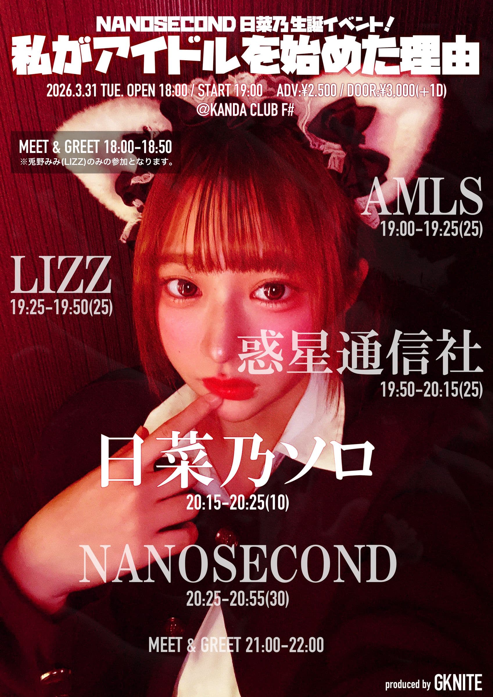 東京を拠点に活動するアイドルグループ・NANOSECONDのメンバー日菜乃の初の生誕イベント「NANOSECOND日菜乃生誕イベント 私がアイドルを始めた理由 produced by GK NITE」が2026年3月31日(火)に神田CLUB F#で開催されることとなった。