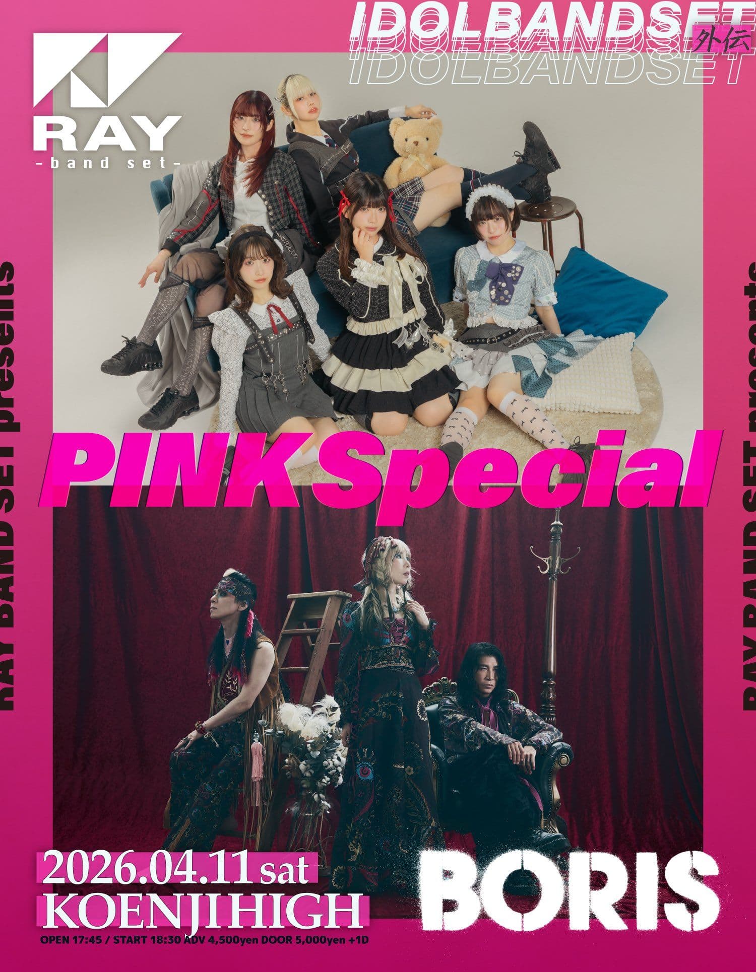 RAYが4月11日に東京・高円寺HIGHで主催企画「IDOLBANDSET外伝 -Pink Special-」を開催する。出演はRAY BAND SETとBoris。公演では、RAYとBorisがそれぞれ発表している重要作『Pink』『PINK』にフォーカスしたスペシャルセットリストが披露される予定で、シューゲイズを軸にしたRAY BAND SETと、轟音で空間を塗り替えるBorisによる異色のツーマンライブとなる。終演後には両者の特典会(チェキ会)も実施される。