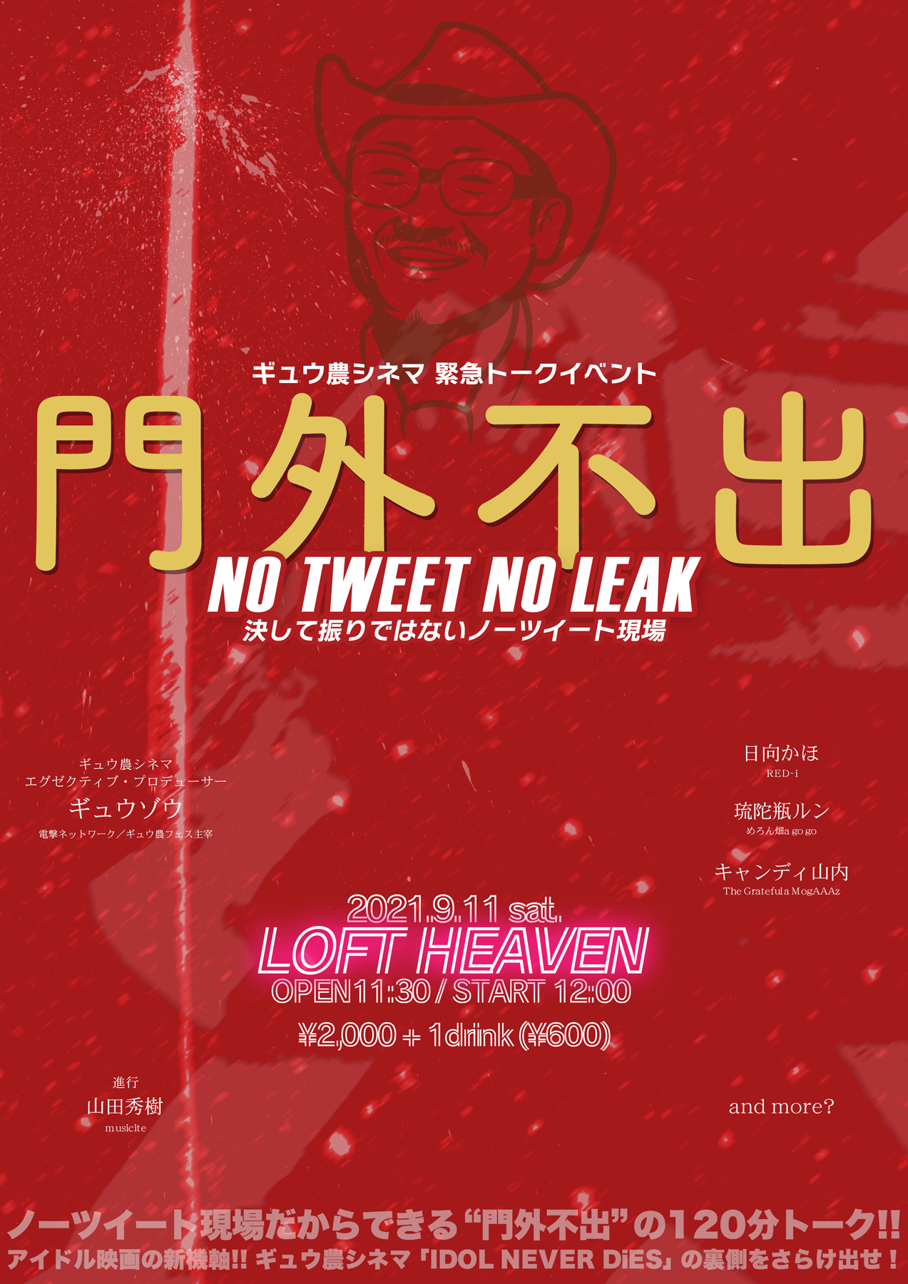 アイドルイベント「ギュウ農フェス」がプロデュースする映画プロジェクト・ギュウ農シネマ「IDOL NEVER DiES」のノーツイートトークイベント「門外不出」の緊急開催が決定しました。