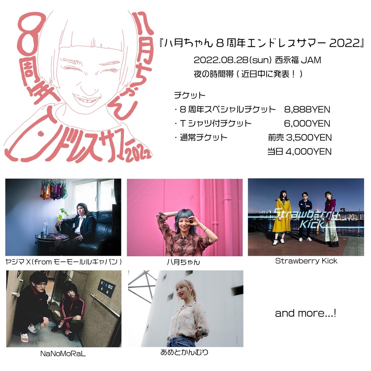 2022年の夏にアーティスト活動8周年を迎える八月ちゃんが、西永福JAMにて主催する八月ちゃんの生誕祭「八月ちゃん8周年エンドレスサマー2022」を開催することが発表された。