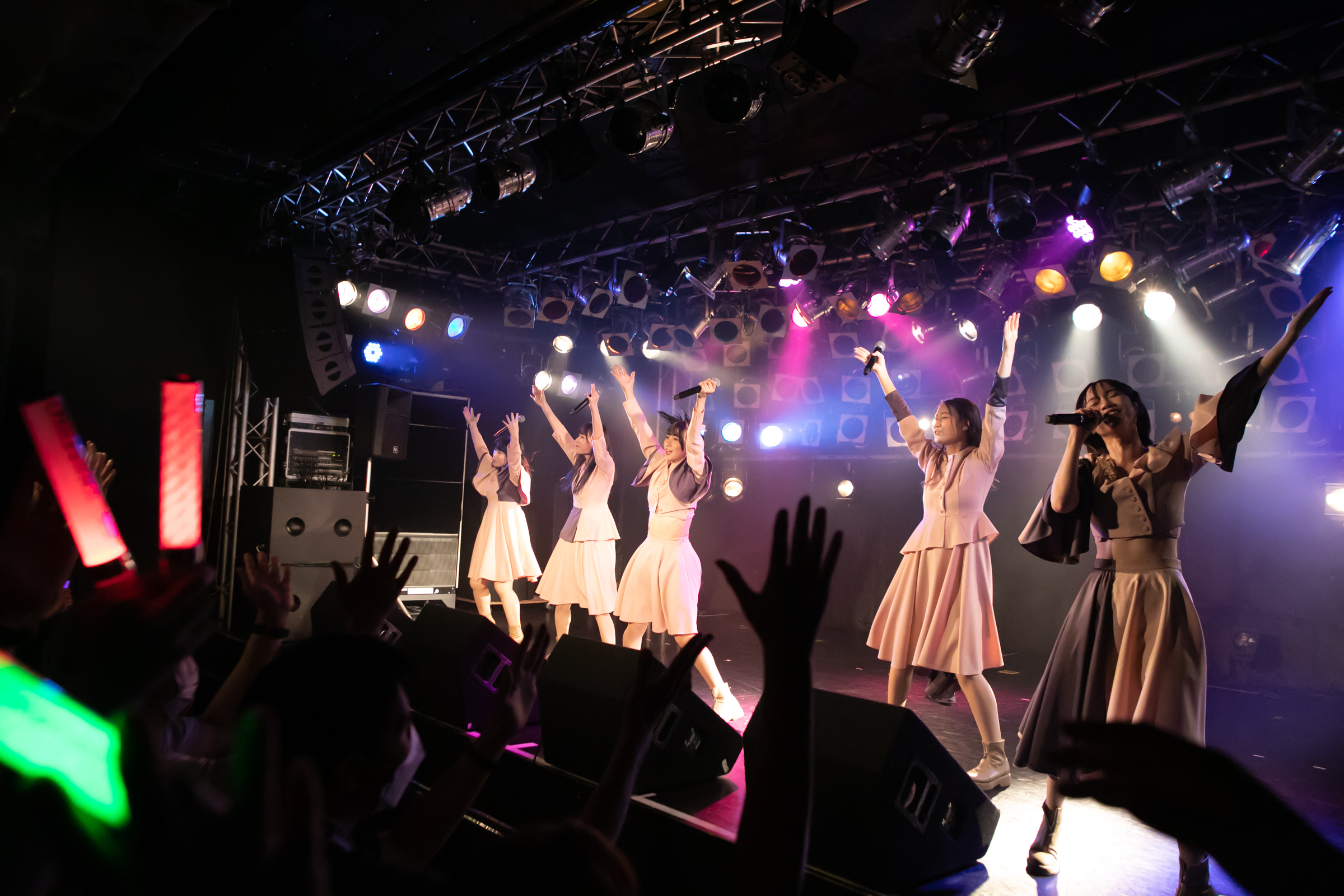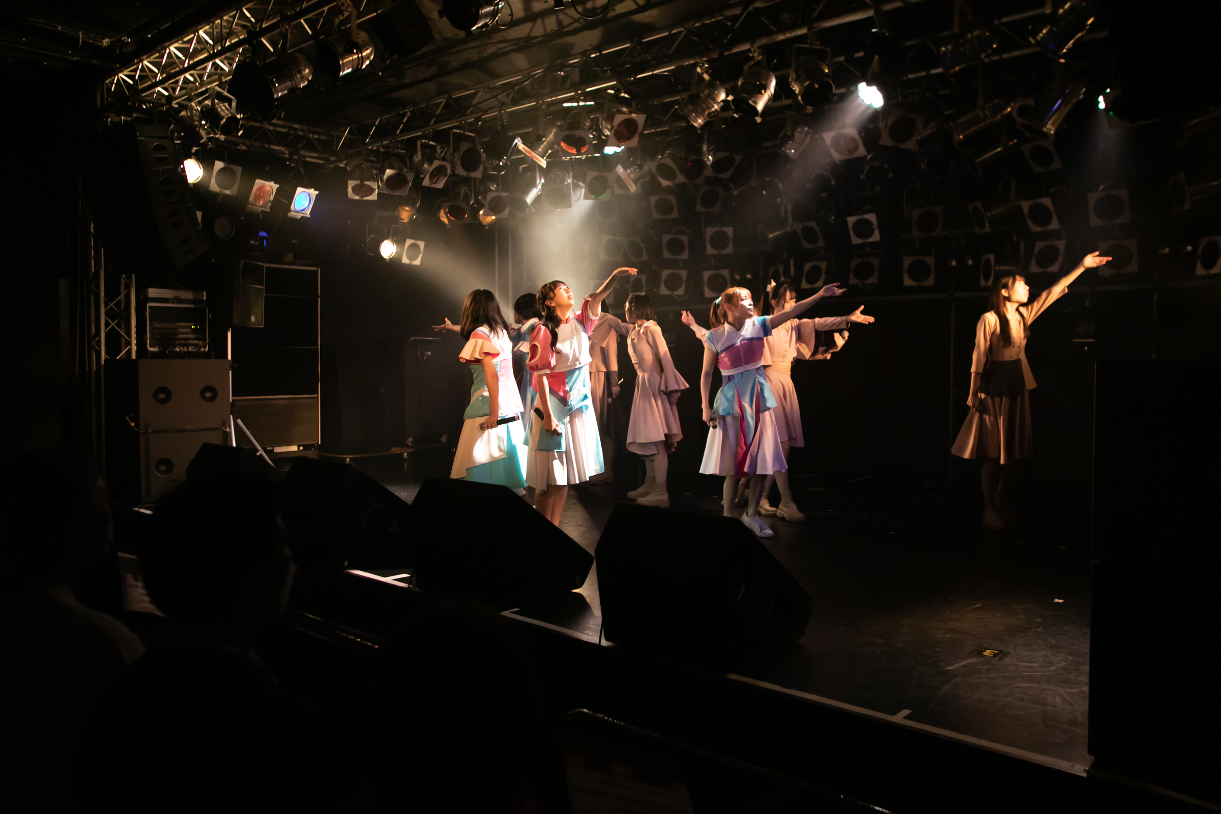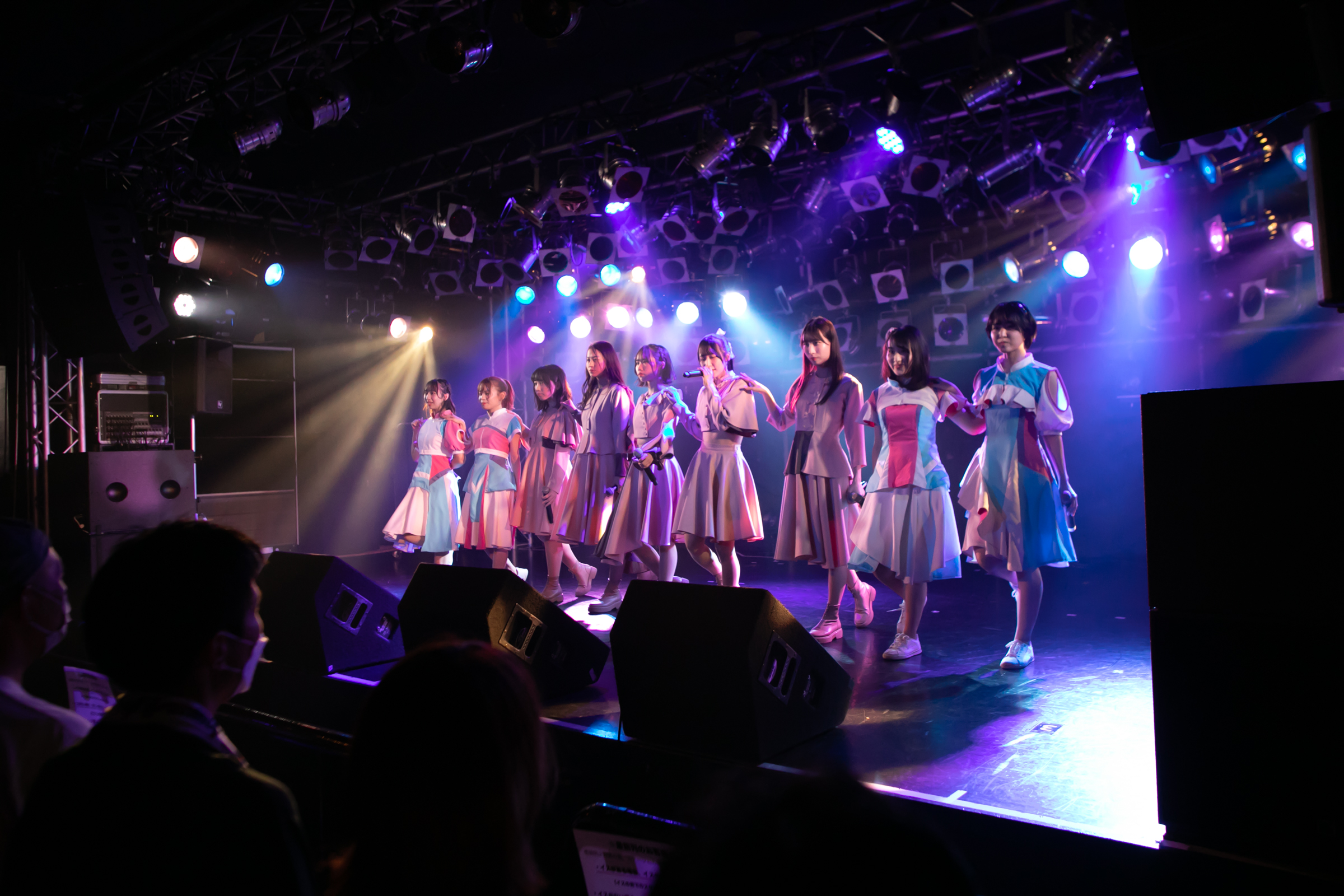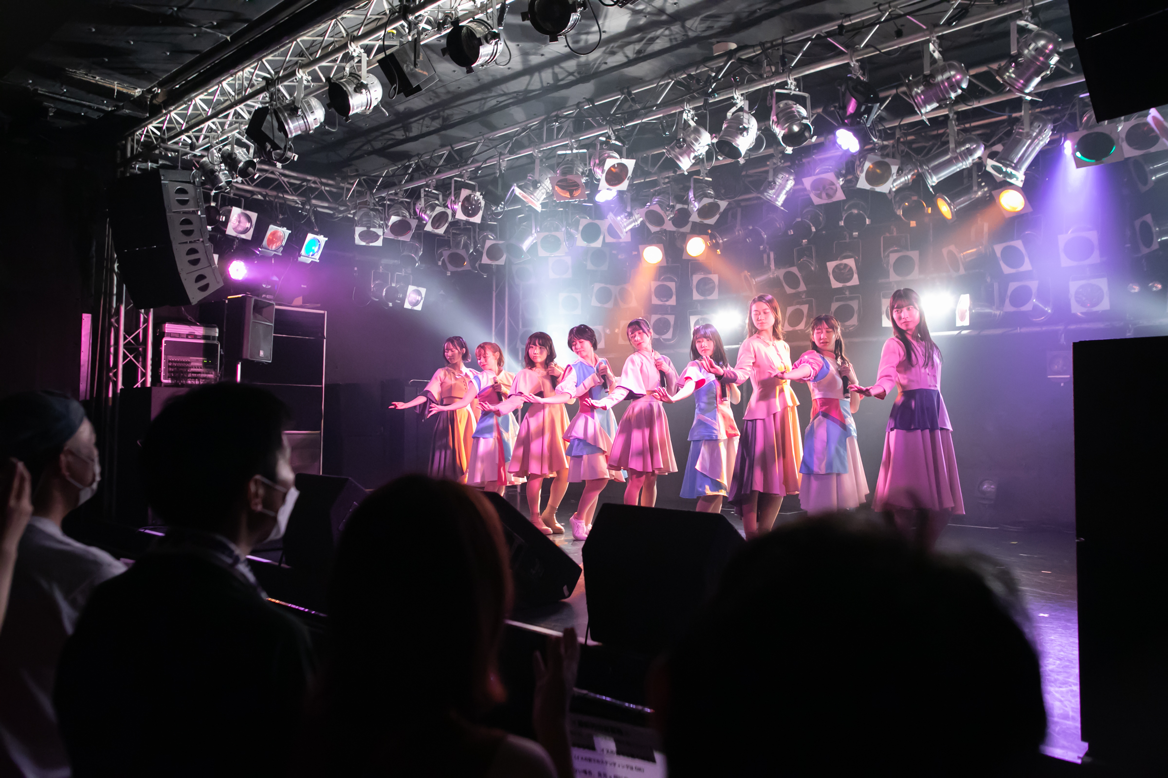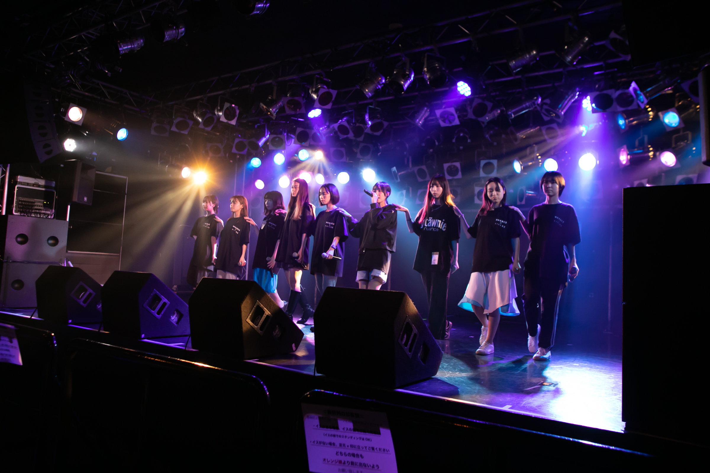 ライブはNUANCEの「under the moon」から始まりタイトル未定の「黎明」、そしてまたNUANCEの「ハルシオン」へと繋がっていく。その曲の間の僅かな時間にそれぞれのグループとその世界観が重なり、そしてまた離れていく唯一無二な時間。DUBRISEを初めて見たファンもこの空間が特別な何かであることに気づくのにそれほど時間はかからなかったのではないだろうか。その中でも特に印象的だったのが「鼓動」の最後の決めポーズ。優雅なダンスから一転した”決め”で終わりを迎えるこのアウトロをNUANCEとタイトル未定の9人バージョンのフォーメーションで組まれた。そしてその中央のポジションに立っていたのはNUANCEの蓮水恭美。現在のタイトル未定では見ることができなくなった幻の5人目のポジションは、事前の練習でタイトル未定の谷 乃愛が蓮水恭美へ丁寧に振り写しをしていたパートでもあり、本番でその決めが見事に決まった瞬間は心の拍手を贈りたいほどに美しい光景だった。