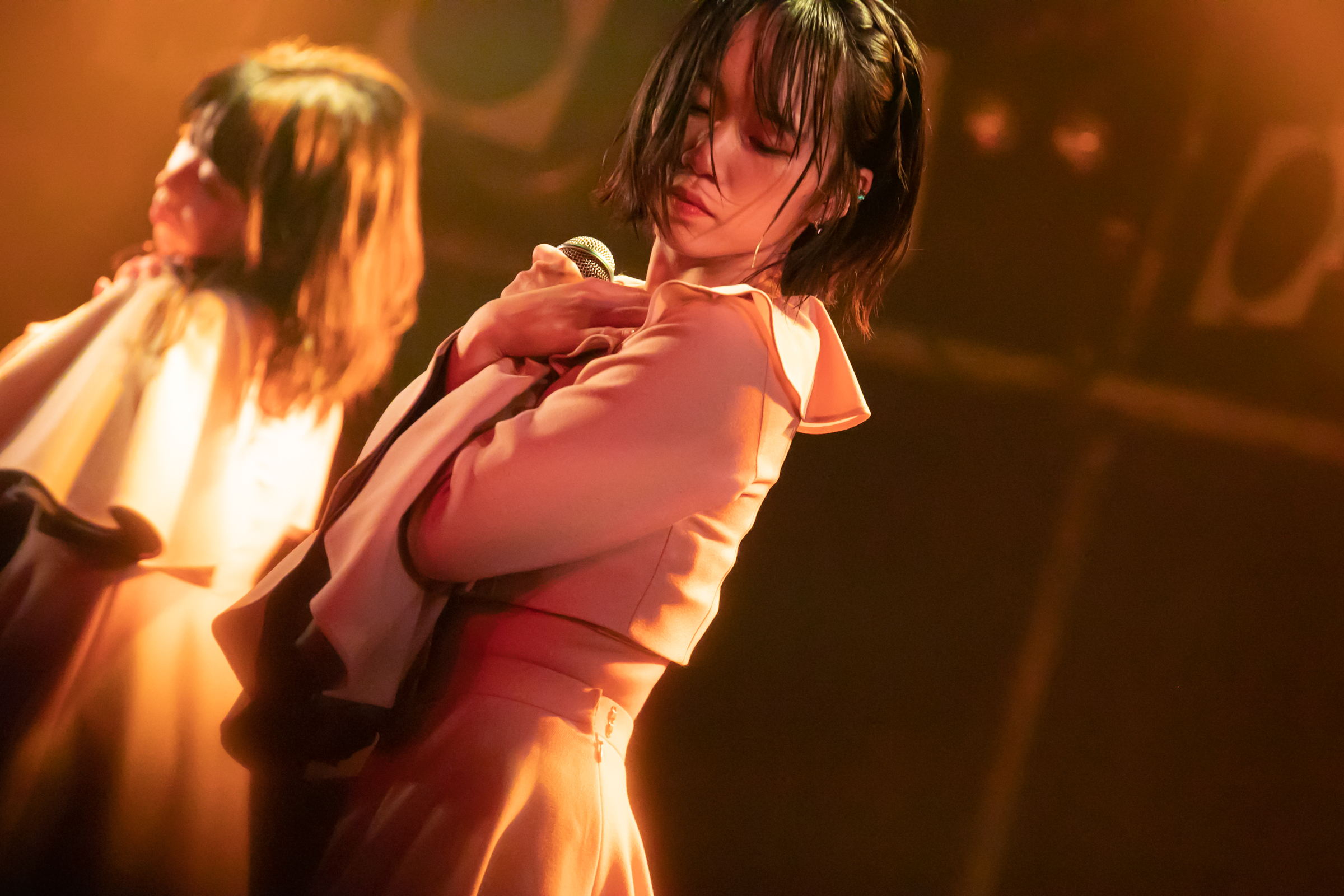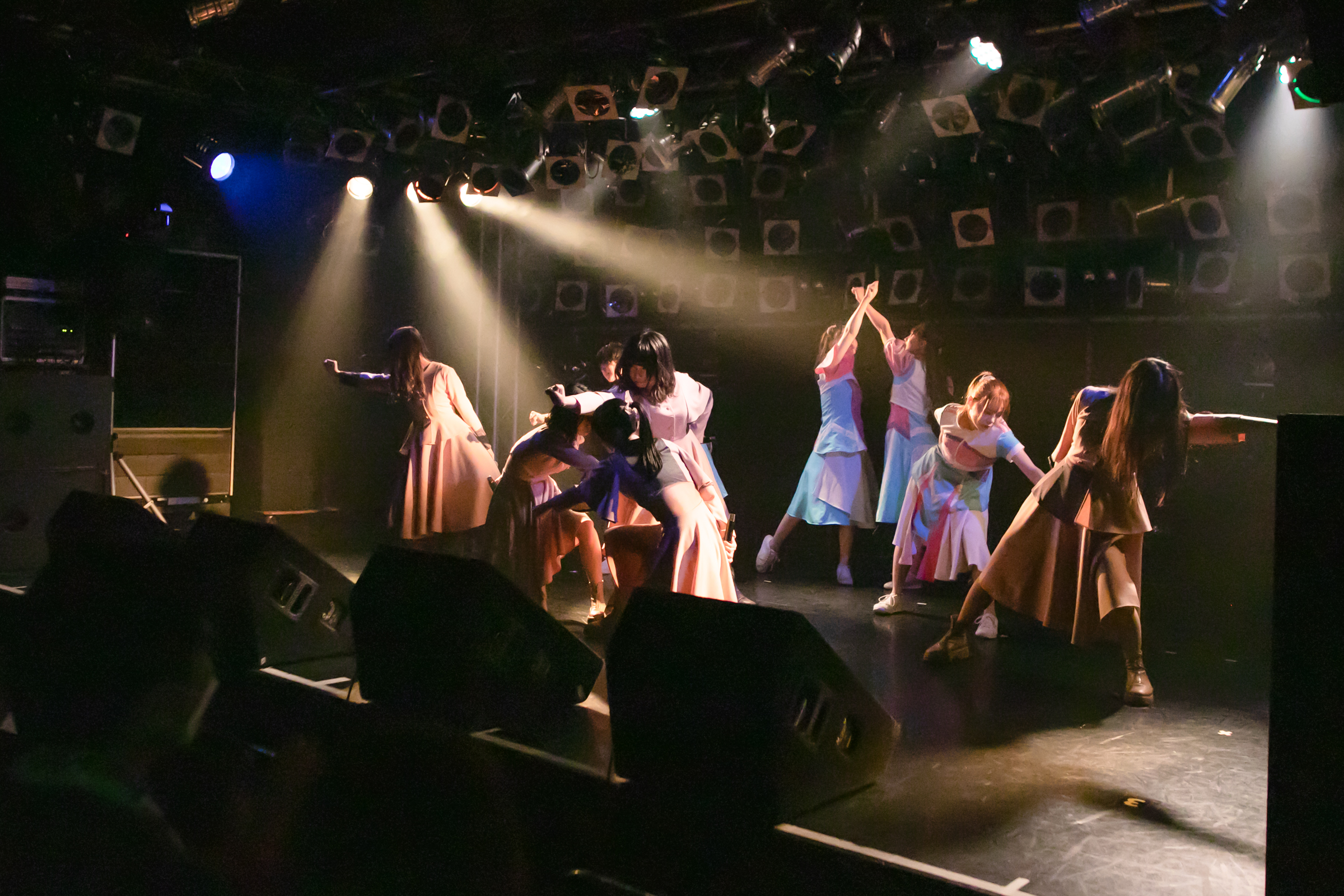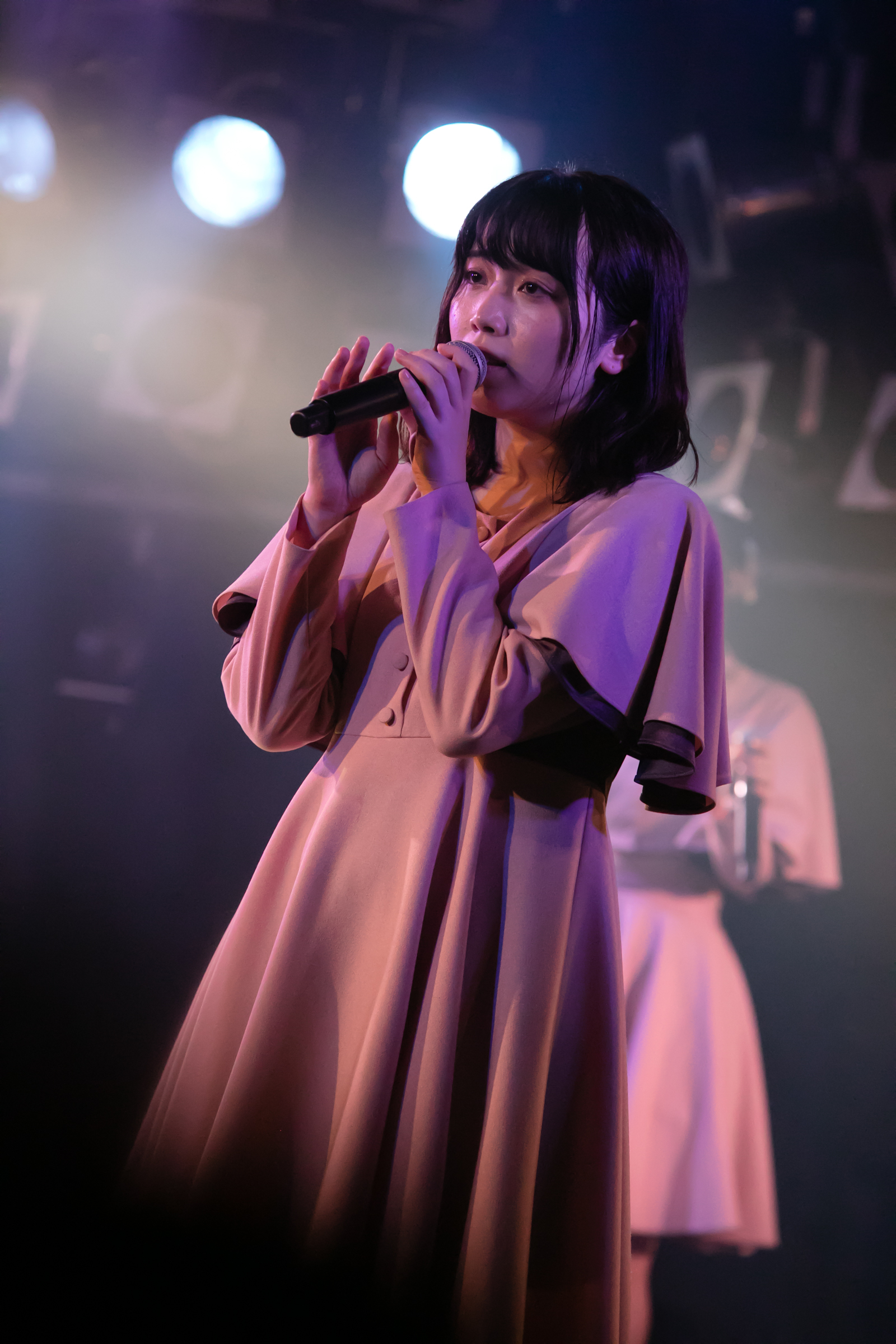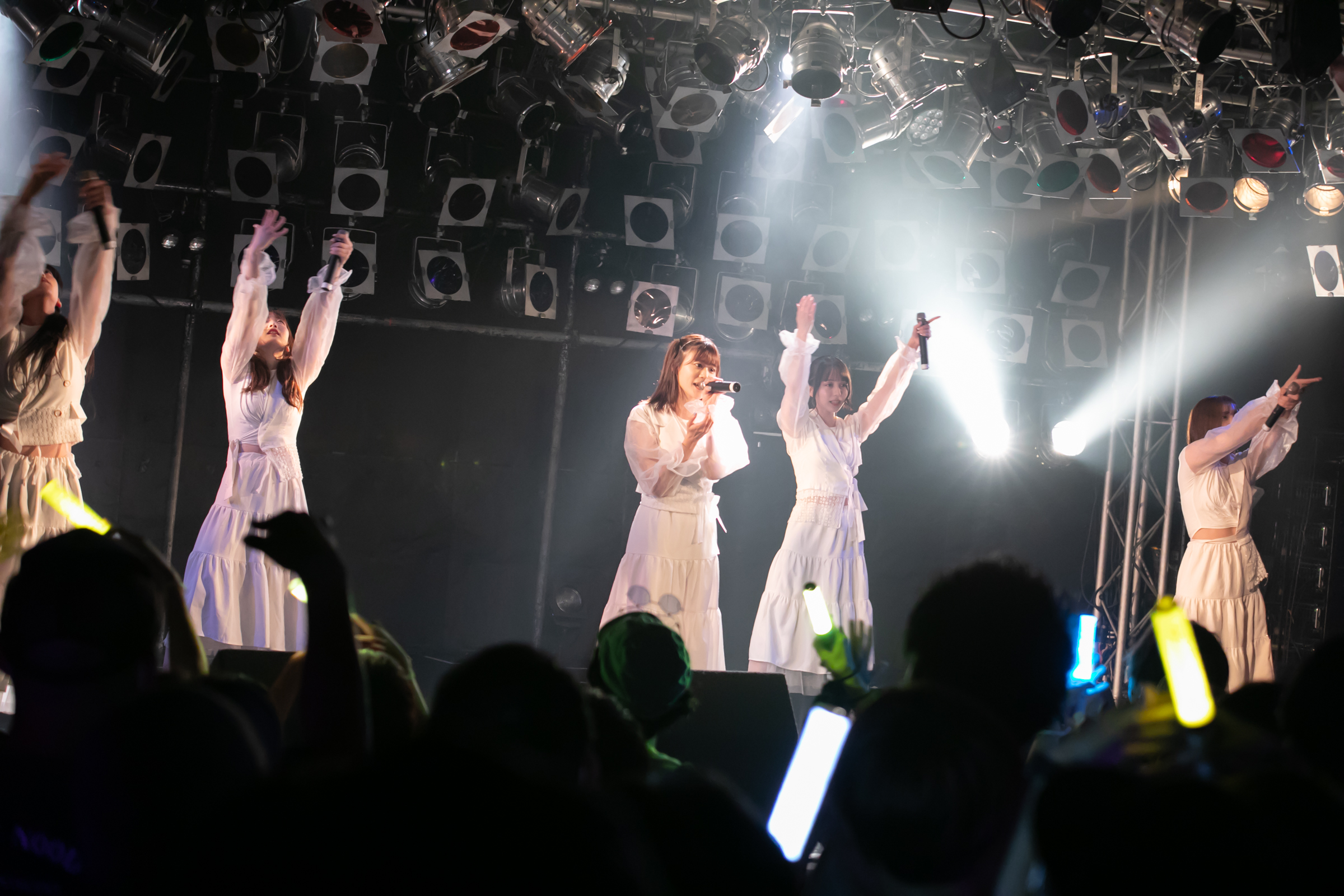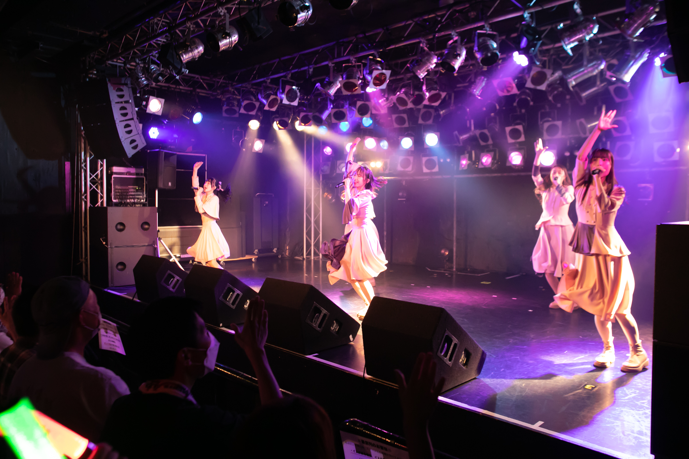 ライブはNUANCEの「under the moon」から始まりタイトル未定の「黎明」、そしてまたNUANCEの「ハルシオン」へと繋がっていく。その曲の間の僅かな時間にそれぞれのグループとその世界観が重なり、そしてまた離れていく唯一無二な時間。DUBRISEを初めて見たファンもこの空間が特別な何かであることに気づくのにそれほど時間はかからなかったのではないだろうか。その中でも特に印象的だったのが「鼓動」の最後の決めポーズ。優雅なダンスから一転した”決め”で終わりを迎えるこのアウトロをNUANCEとタイトル未定の9人バージョンのフォーメーションで組まれた。そしてその中央のポジションに立っていたのはNUANCEの蓮水恭美。現在のタイトル未定では見ることができなくなった幻の5人目のポジションは、事前の練習でタイトル未定の谷 乃愛が蓮水恭美へ丁寧に振り写しをしていたパートでもあり、本番でその決めが見事に決まった瞬間は心の拍手を贈りたいほどに美しい光景だった。