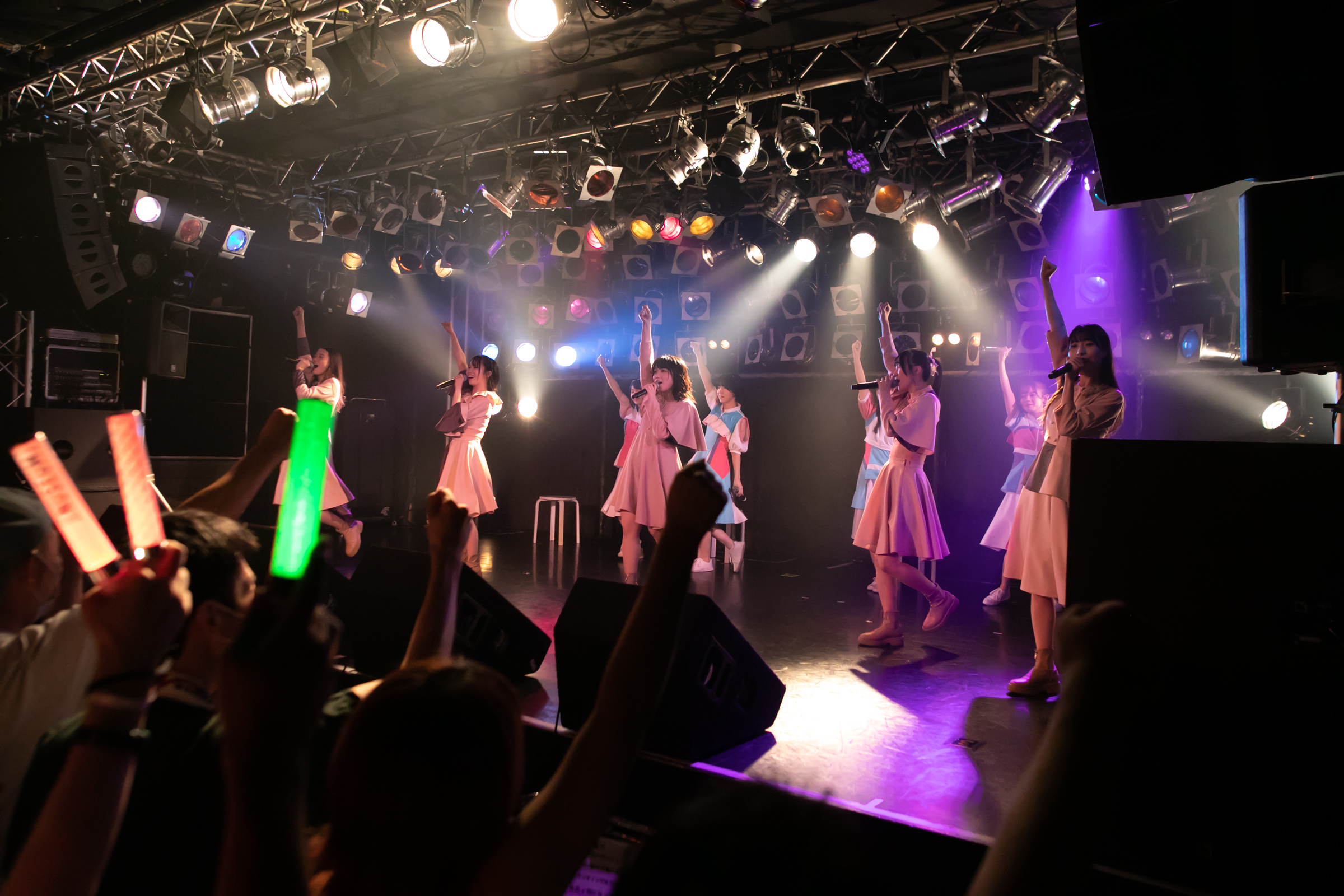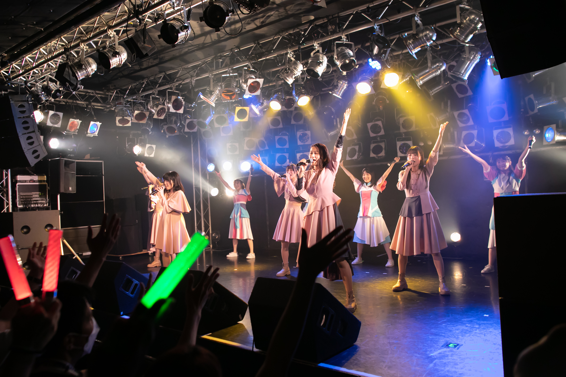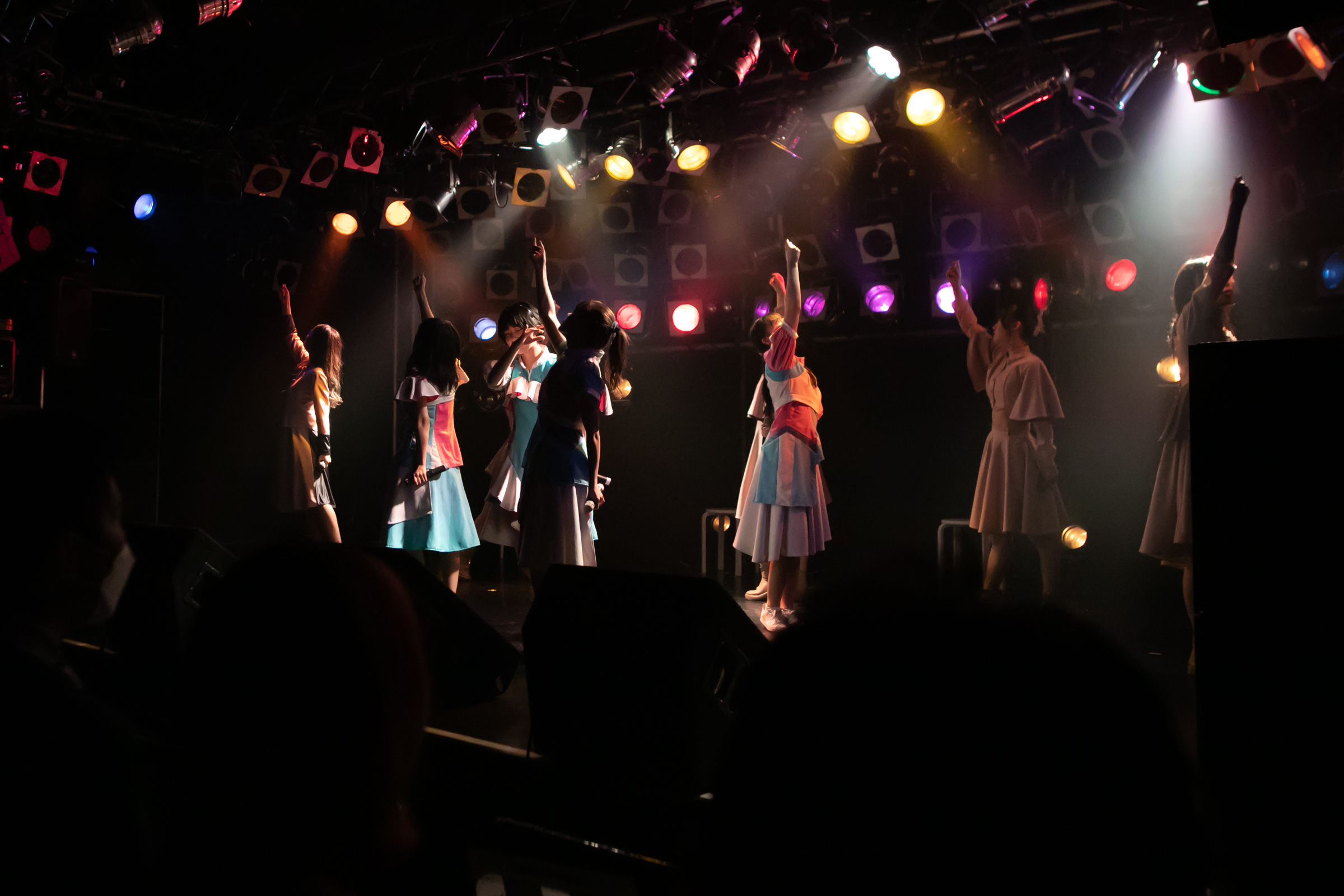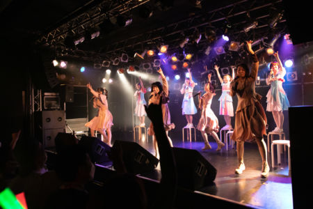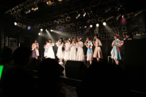 そしてfujisaki setも「雨粒」で終わりを迎え、クライマックスはNUANCEとタイトル未定が揃っての「みんなでミライサーカス」。この曲では歌い始めを担当する稀咲妃菜に対して、目前に控えた誕生日を祝うメンバーカラーの黄色のサイリウムを観客が一斉に振るサプライズ演出があり、さらに”ミライサーカス”にも、カエル(阿部葉菜)、ピエロ(冨樫優花)、クワッカワラビー(谷 乃愛)、シマエナガ(川本空)が新たな団員が加入。この日一番の大賑わいの中でDUBRISE∞は大団円となった。