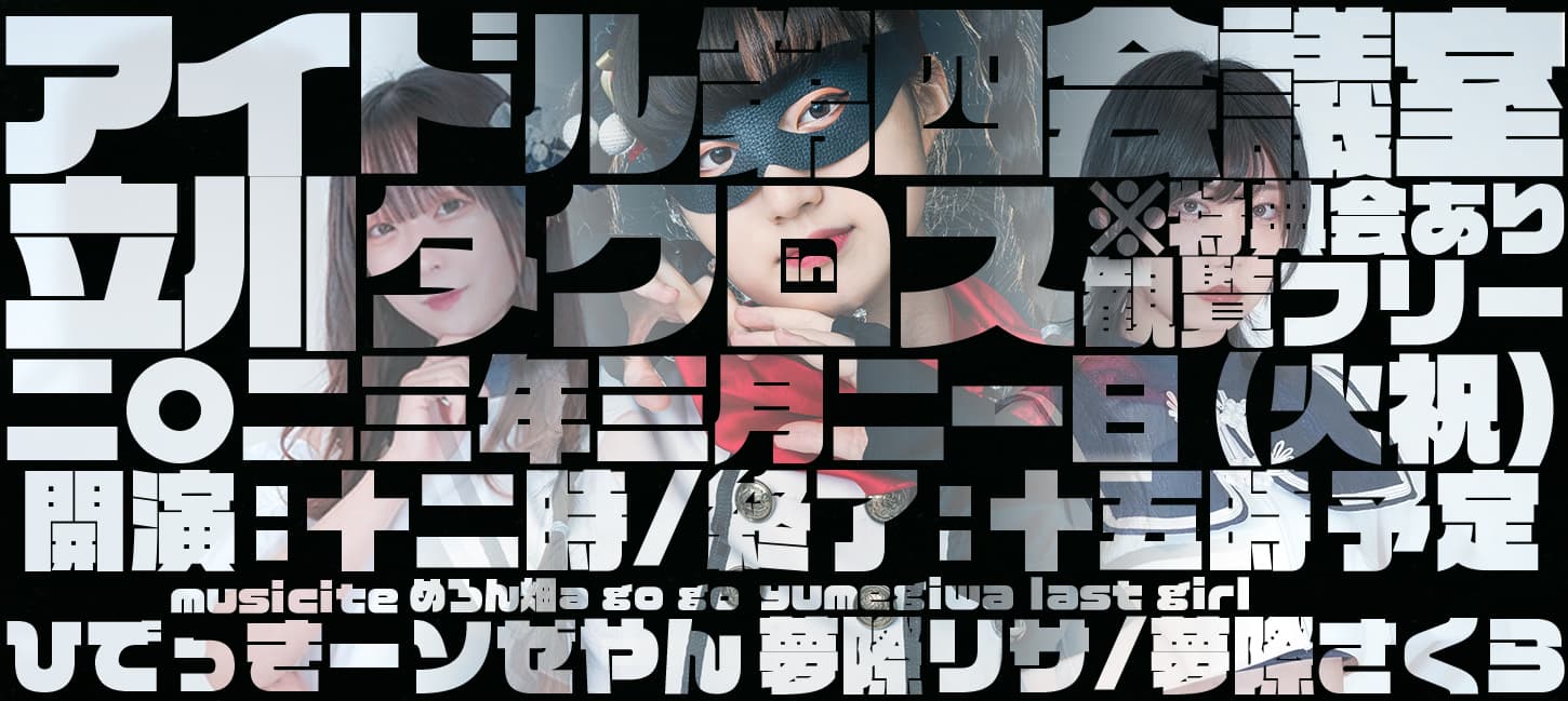 3月21日(火祝)は、ひでっきーこと僕が運営しているラジオ「アイドル第四会議室」(FMたちかわ)初のリアルイベント、「アイドル第四会議室 in 立川タクロス」が開催されます。