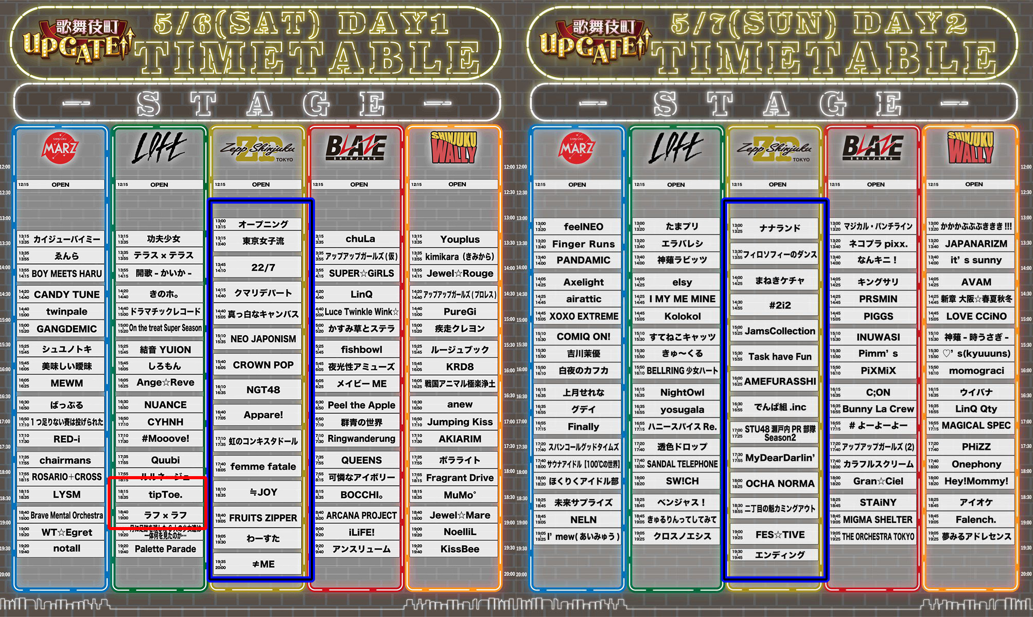 個人的に面白いなと思ったのが両日のZepp Shinjukuの出演者(青枠)と5/6(土)の新宿Loftの夕方(赤枠)です。