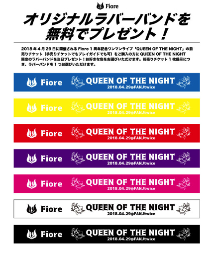 月下美人はたった一夜に一度しか咲かない儚く美しい花。月下美人のように二度は見られないこの夜だけの演出とパフォーマンスで観客を迎え、メンバーの1人でもあり、Fioreの衣装デザインも担当している中村栞菜がデザインした「QUEEN OF THE NIGHT」限定Tシャツも販売される。