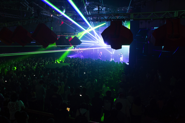 メインステージ上方を囲うように並ぶオクタゴンスピーカーとイベント開始時からフロア中央に鎮座していたサブウーハー、そしてメインスピーカーのそれぞれが大出力のサウンドを吐き出し始めるとスタジオコーストは最響で最驚な轟音にあふれ、そこにオーバーラップするようなレーザー光線が唯一無二な音楽空間を描き出す。