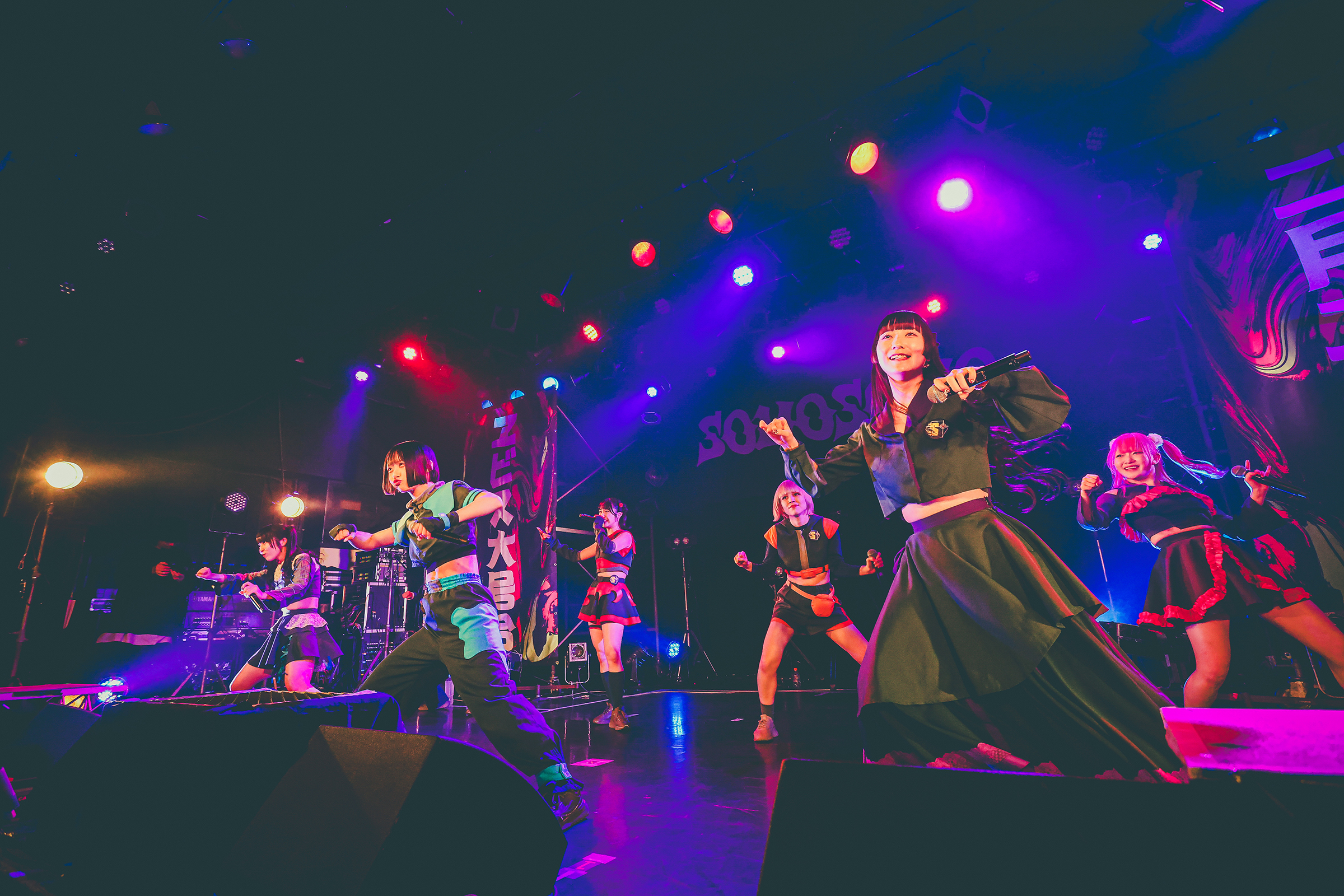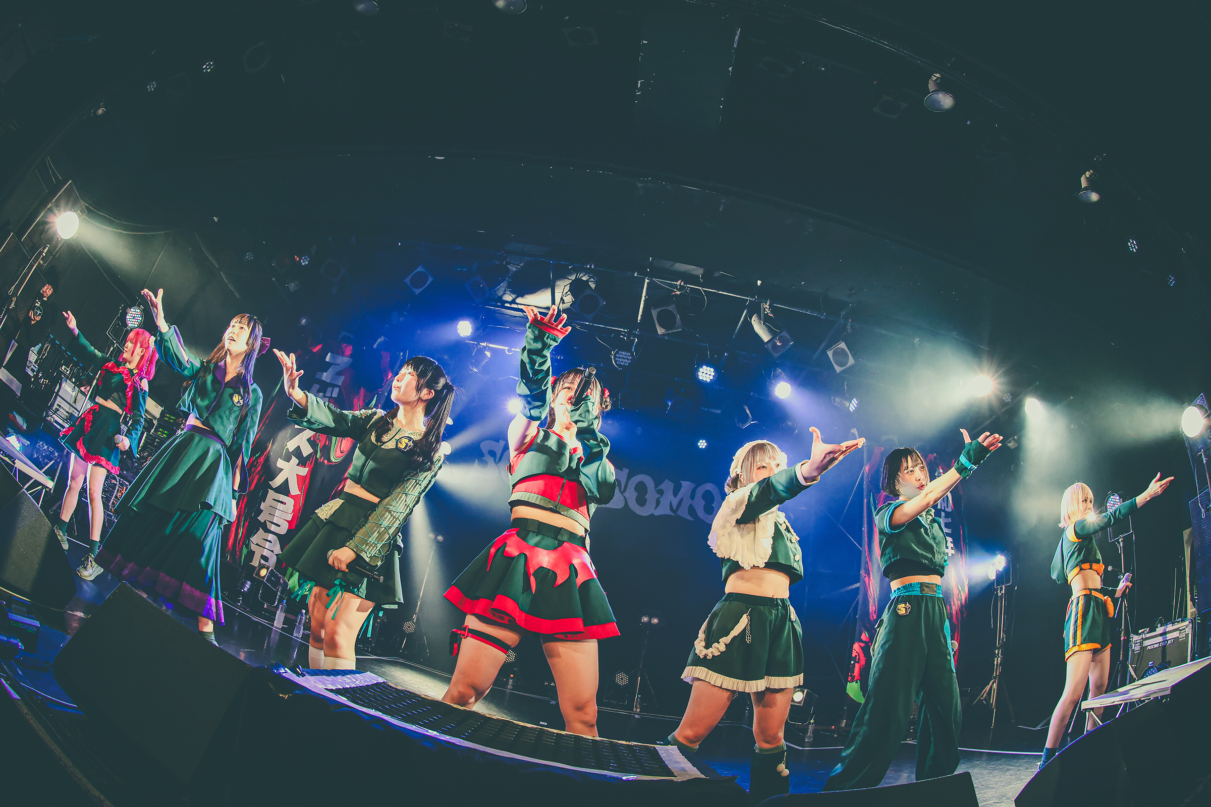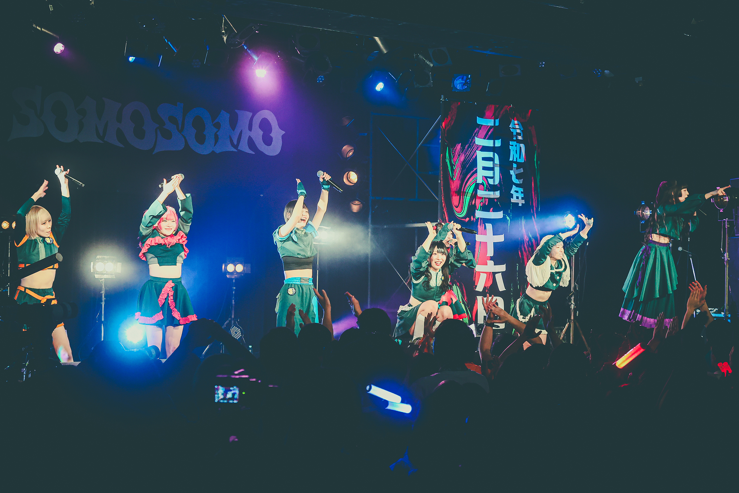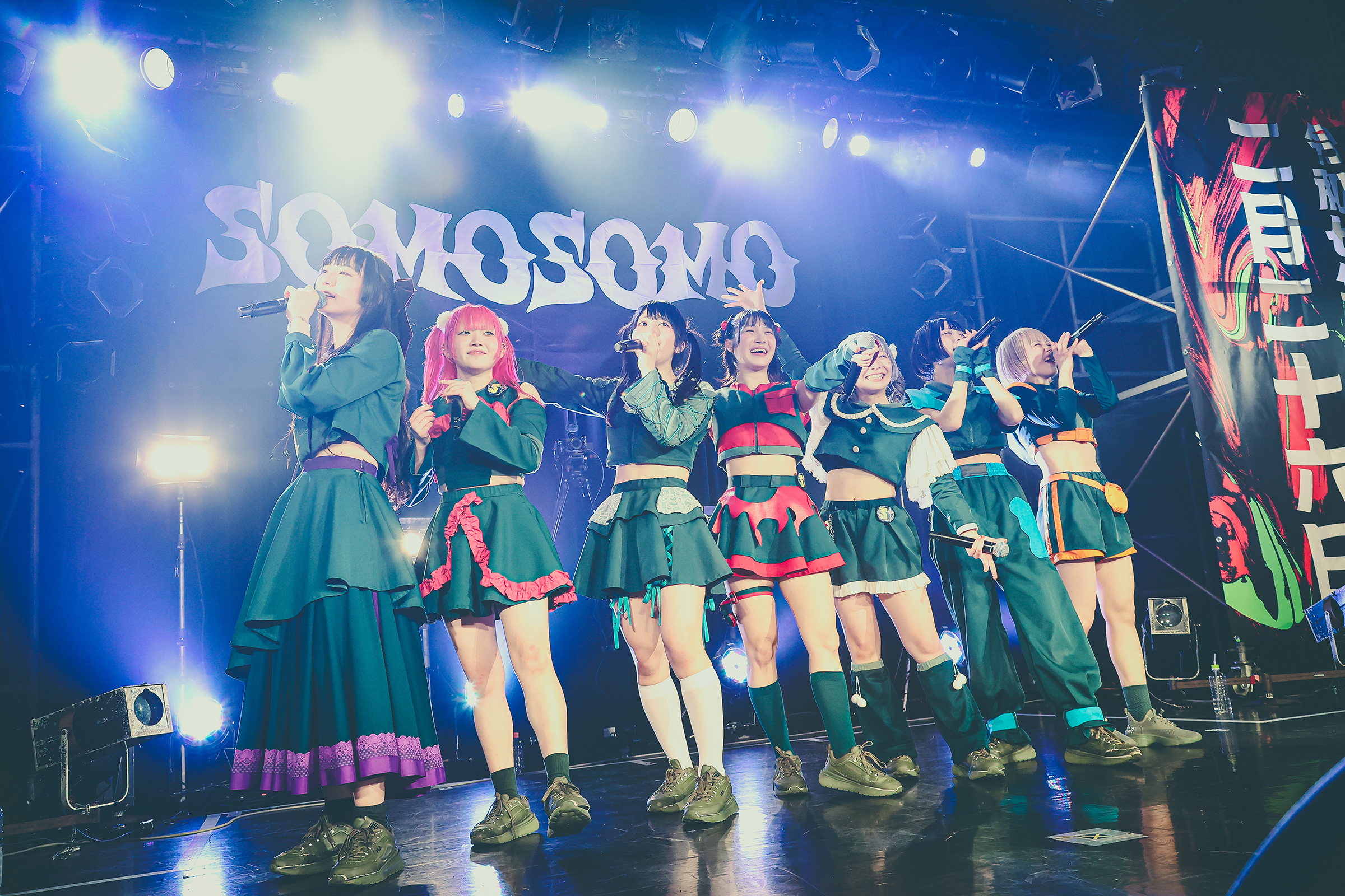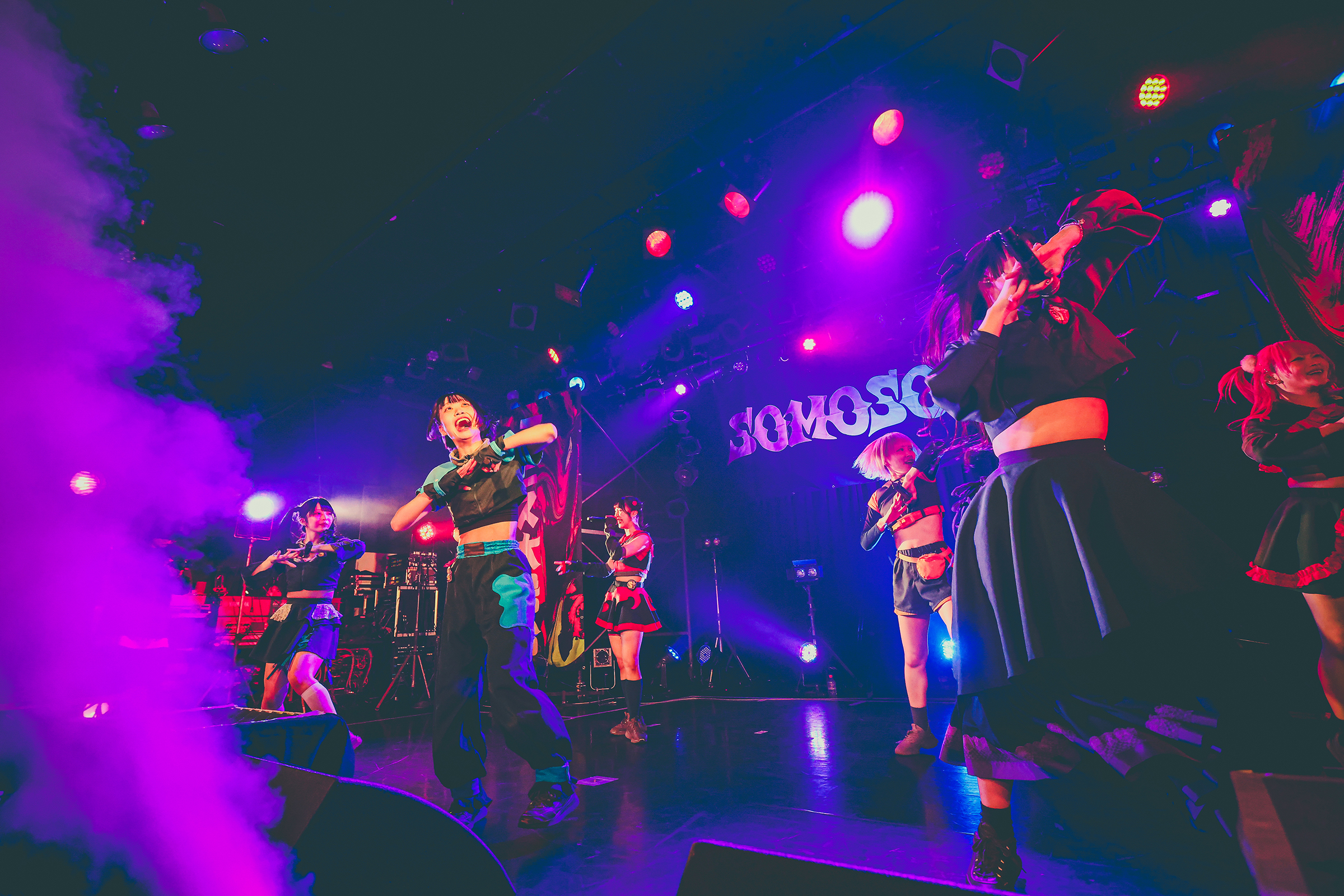 SOMOSOMOにとって今回の恵比寿LIQUID ROOMでのワンマンライブは2020年7月7日以来となるリマッチ的ワンマン。当時は前事務所からの独立を控えた中の公演となったがその時にステージに立っていたアルティメット ミキ、ゴゴノ コトコ、ツクヨミ ケイコ、コモレビ ヒヨリの4人に加え、今回のワンマンには2023年4月に加入したアオイ アオネ、シャンシャン マイ、トマラナイ チヒロを加えた7人体制で再びリキッドのステージに帰ってきた。