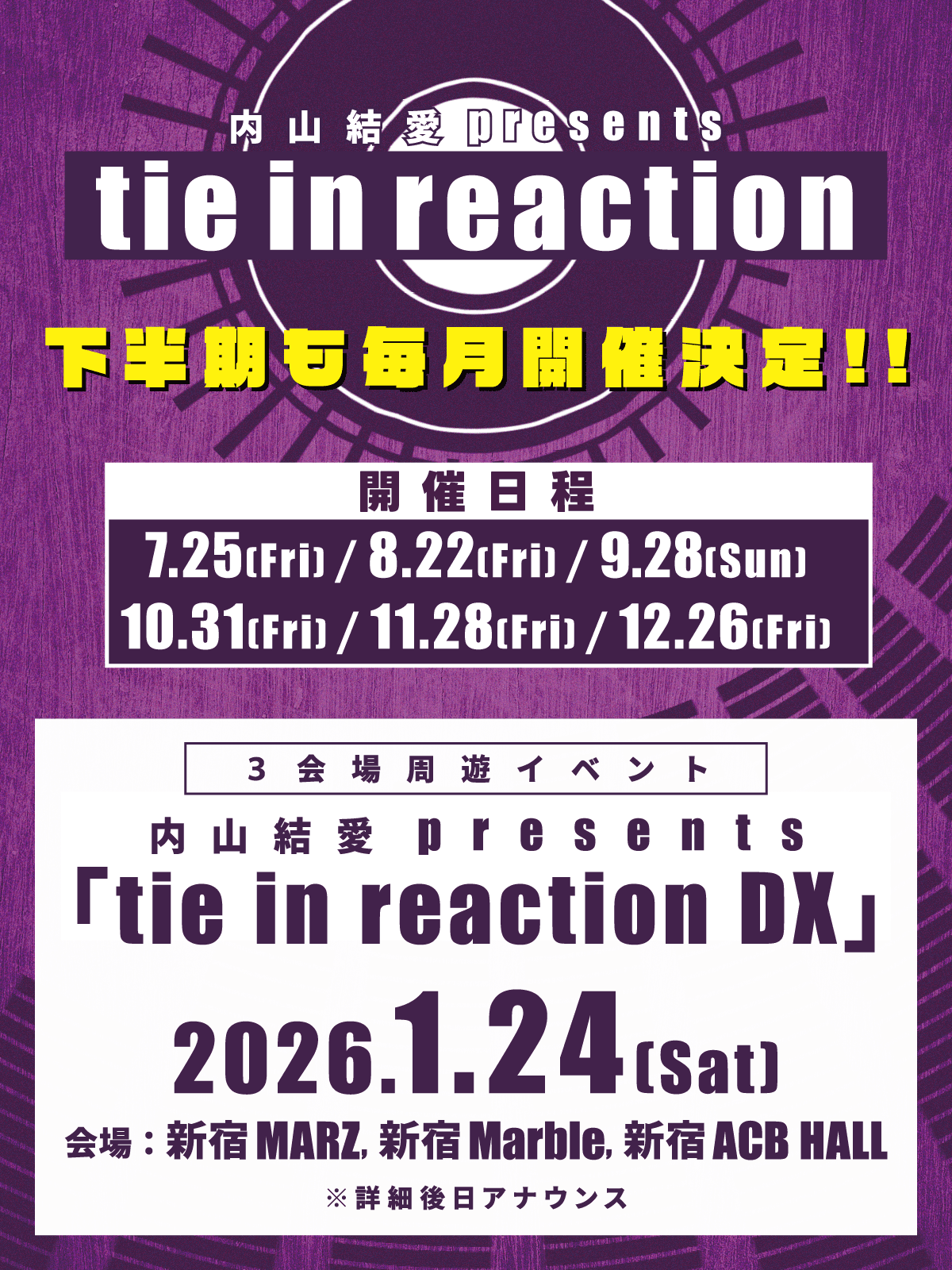 インディーバンドと楽曲派アイドルの邂逅を毎月生み出してきたこのイベントが、好評を受けて7月以降も継続開催されることが決定。さらに、2026年1月24日には新宿MARZ、新宿Marble、新宿ACB HALLの3会場を使用したサーキットイベント「tie in reaction DX」の開催も発表された。