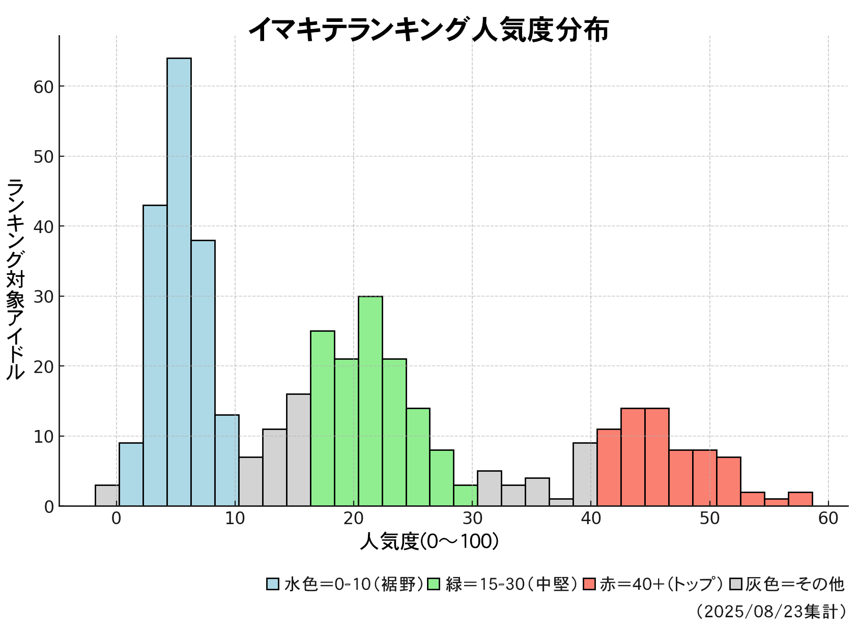 上のグラフは、人気度ごとにどれくらいのアイドルが分布しているかを示した図です。