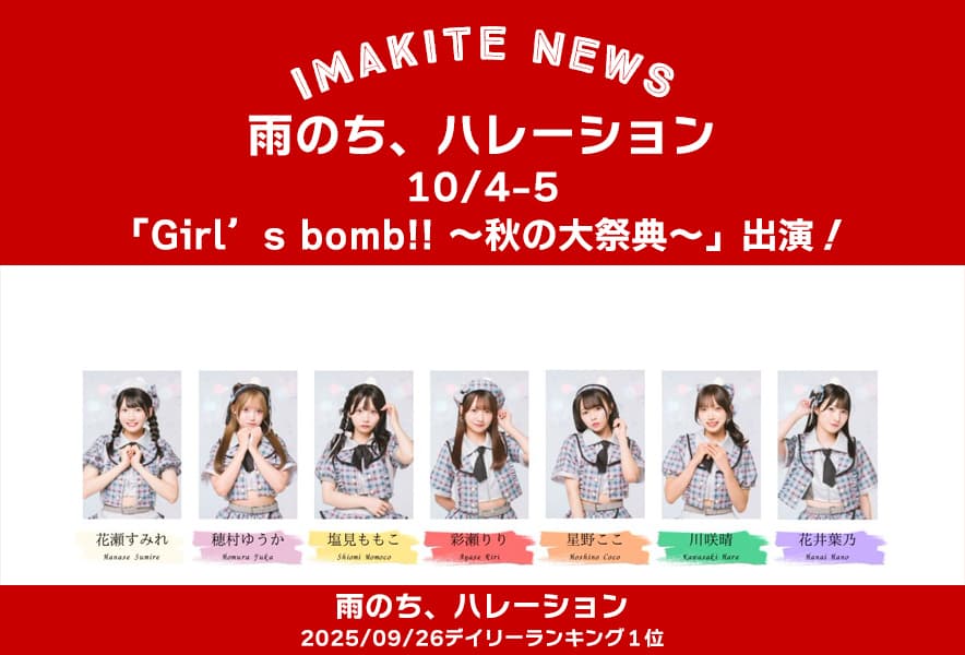 10月4日(土)・5日(日)開催の「Girl’s bomb!! 〜秋の大祭典〜」DAY1&DAY2に出演。ランキングの勢いそのままに大型野外イベントで存在感を示せるか注目だ。
