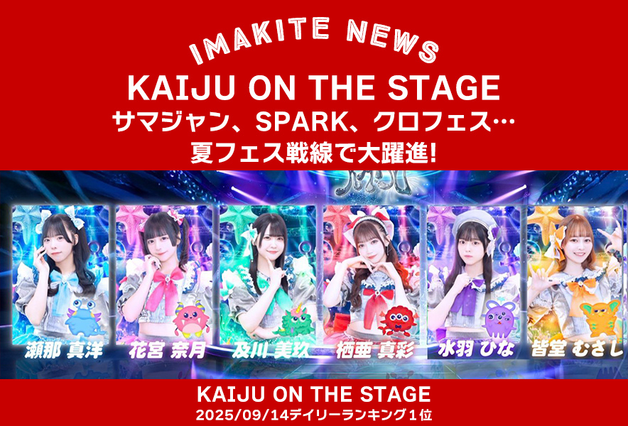 2025/09/14 5:37アイドル第四編集室【イマキテNews】KAIJU ON THE STAGE、サマジャン、SPARK、クロフェス…夏フェス戦線で大躍進KAIJU ON THE STAGEイマキテランキング