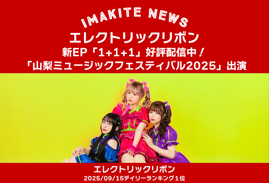 2025/09/15 7:29アイドル第四編集室【イマキテNews】エレクトリックリボン、新EP「1+1+1」好評配信中!「山梨ミュージックフェスティバル2025」出演イマキテランキングエレクトリックリボン