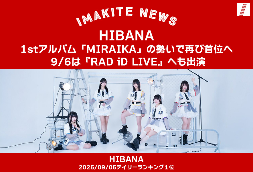 2025/09/05 8:00アイドル第四編集室【イマキテNews】HIBANA、1stアルバム「MIRAIKA」の勢いで再び首位へ 。9/6は『RAD iD LIVE』へも出演HIBANAイマキテランキング